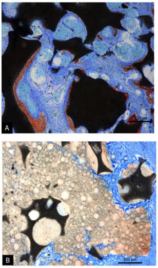 Photomicrographs of ground sections representing the healing after 2 weeks at the MR (A) and MR-inject (B) groups. In the MR group (A), new bone was formed on the granules, separated by vascularized connective. In the MR-inject group (B), smaller diameter particles were embedded into water-based gel containing nanoparticles. Note osteoclast on the surface of the water-based gel. Stevenel’s blue and alizarin red stain. 100× magnification.
