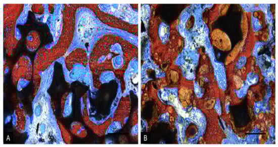 Two sections of approximately 100–150 µm were prepared using precision cutting/grinding equipment (Exakt, Apparatebau, Norderstedt, Germany) and ground until histological slides with an approximate thickness of 50–60 µm were obtained. The slides were stained with either toluidine blue or Stevenel’s blue and alizarin red, as performed in previous studies by our research group [,].