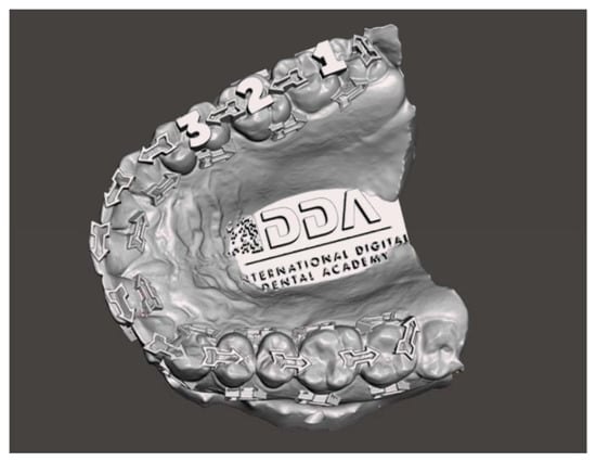 In each scan, the method of scanning followed the International Digital Dental Academy Scan Training Model [] (Figure 2): starting on the upper left-most distal molar, continuing occlusally across the full arch, pivoting to the palatal side to capture the palatal surfaces, and then returning along the buccal surface with a constant progression.