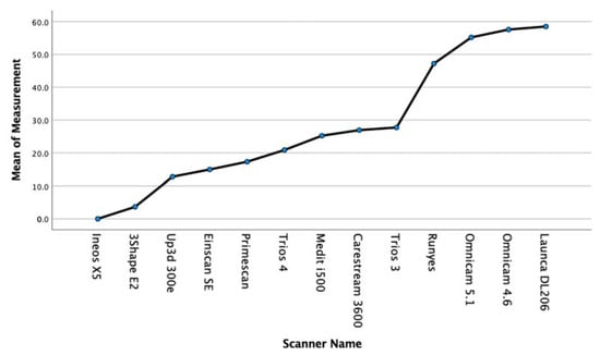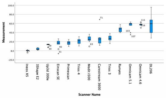 All possible pairwise comparisons were made using a one-way analysis of variance (ANOVA) for independent groups, with a Tukey significance level of 0.05, of multiple comparisons using SPSS 26 by IBM []. Bartlett’s test was used to test the homogeneity of variances. Precision was defined from the superimposition between the different scans made with the same intra-oral scanner. The comparisons available for each scanner were calculated and the precision of each scanner was then expressed as a mean.