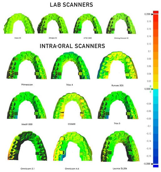 Our present study aimed to compare the full arch trueness and precision of the leading intra-oral scanners available in 2020 (specifically the Dentsply Sirona Primescan and Omnicam (both 4.6 and 5.1 version), 3Shape Trios 3 and 4, Carestream 3600, Launca DL206, Runyes, and Medit i500) as well as a low-cost lab light scanner (Shining Einscan SE) and more mainstream dental lab scanners (Dentsply Sirona Ineos X5, 3Shape E2, and UP3D 300e).