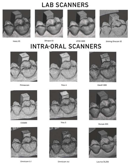 - Mangano, F.; Gandolfi, A.; Luongo, G.; Logozzo, S. Intraoral scanners in dentistry: A review of the current literature. BMC Oral Health 2017, 17, 149. [Google Scholar] [CrossRef] [Green Version]