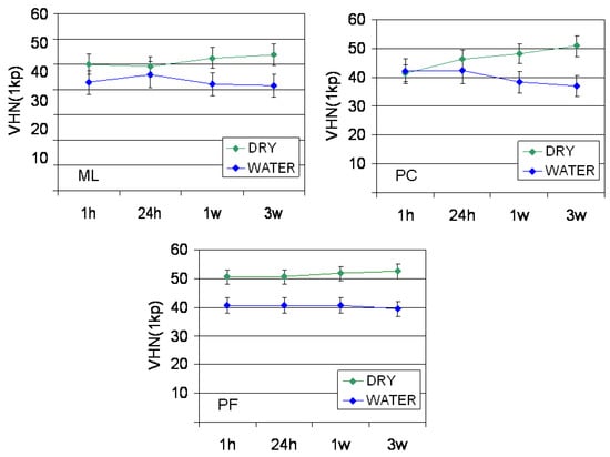 The results of hardness measurements are presented in Figure 1. For all materials statistically insignificant differences were found in the VHN1kp values between the time intervals tested within the same storage condition (p > 0.05). Water storage resulted in a significant hardness reduction in PF (all time intervals, p = 0.001–0.005), PC (1 w, 3 w, p = 0.008 and 0.016 respectively) and ML (3 w, p = 0.026).