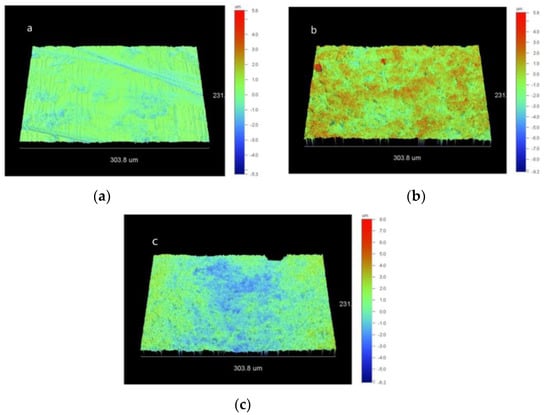 Representative 3D-profilometric images of the zirconia surfaces per treatment group are illustrated in Figure 2a–c. Polished specimens (CL) exhibited a homogeneous texture with small peaks and shallow valleys, whereas grit-blasted groups (AL and SJ) demonstrated randomly distributed deep valleys and high peaks. The results of the 3D-roughness parameters are summarized in Table 2. For Sa, statistically significant higher values were documented in AL and SJ groups in comparison with CL (p < 0.01), but not between AL and SJ (p = 0.562). A similar statistical ranking was found for Sz; there were statistically significant differences between SJ–CL and AL–CL groups (p < 0.01), but not between AL and SJ groups (p = 0.353). Sdr demonstrated significant differences between SJ–CL and AL–CL groups (p < 0.01), but insignificant difference between SJ and AL groups (p = 0.81). Finally, for Sci the ranking of the statistically significant differences was SJ > AL > CL (p < 0.01).