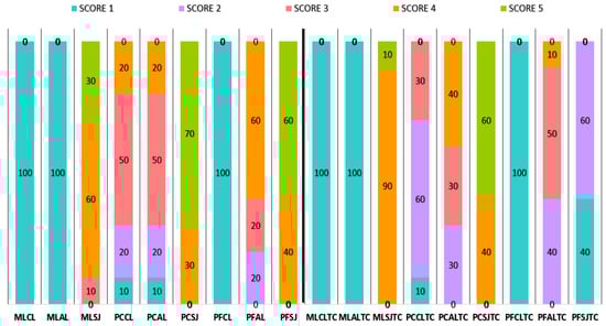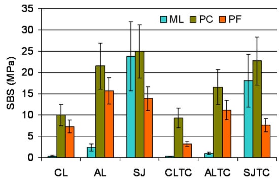 The results of the failure mode analysis are presented in Figure 5. Adhesive failures (score 1) occurred in MLCL, MLAL and PFCL groups under isothermal testing and after thermal-cycling. Pearson’s Chi-square analysis showed that SJ treatment in ML group provided significantly higher score than CL and AL groups. In PF group, SJ and AL treatments presented similar scores, except for ALTC and SJTC, which were significantly different. In PC group, PCSJ, PCSJTC and PCAL were significantly different from all other subgroups.