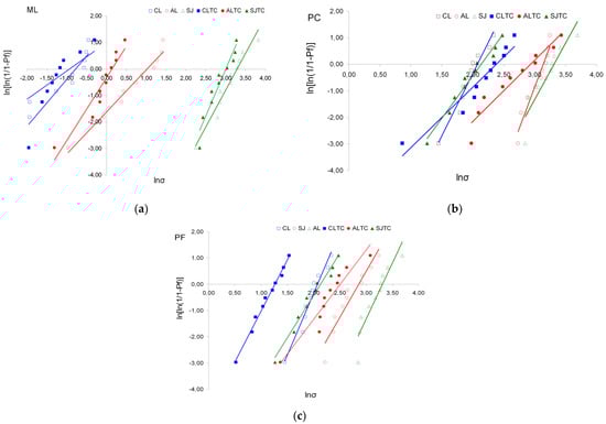 Weibull stress distribution graphs (ln/ln plots) of the various treatments per material. The slope of each graph (vs y axis) indicates the Weibull scale (m), while the intersection of the graph with the x axis indicates the Weibull modulus (σο, 63.2% fracture probability). (a) ML: Multilink Automix, (b) PC: PermaCem 2.0, (c) PF: Panavia F 2.0, CL: Control, AL: Alumina, SJ: Sil-Jet, TC: Thermal-cycling.