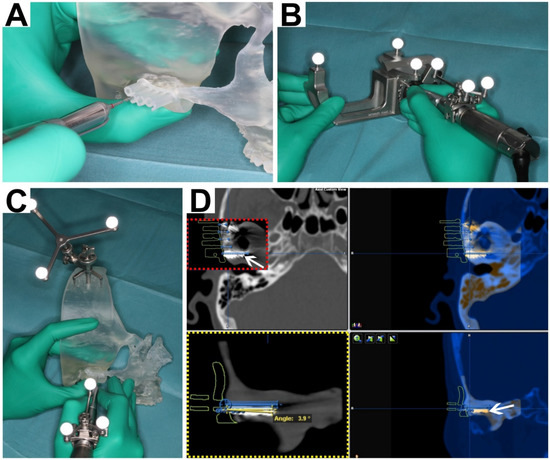 Using iPlan© CMF, VSP was performed with determination of the aspired screw length, position and vector (Figure 2C), as it would be routinely performed in clinical routine prior to TMJ surgery. The feasibility and VSP of real-time navigation in TMJ replacement surgery have been formerly described [20]. For real-time navigation, holes (1 mm × 1 mm × 1 mm) were placed with registration landmarks on the upper incisor midpoint, the anterior nasal spine, the mesial buccal cusp of the first molars of the upper jaw and the zygomatic process of the temporal bone. Consequently, cone beam CT (CBCT; PaX-Zenith3D, VATECH, Hwaseong, Korea) was conducted and imported into iPlan© CMF. The virtually planned drilling guides of a fictional-patient-matched TMJ prosthesis were imported as well to visualize the planned position (Figure 1C).