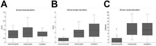 Boxplots of the measured deviation from virtual surgical planning (median, box height: interquartile range, whiskers: lowest and highest value). (A) Screw head deviation [mm]. (B) Screw length deviation [mm], significant difference of advanced guide to both other groups * = p < 0.003. (C) Screw vector deviation [degree], significant difference of advanced guide to both other groups * = p < 0.001.