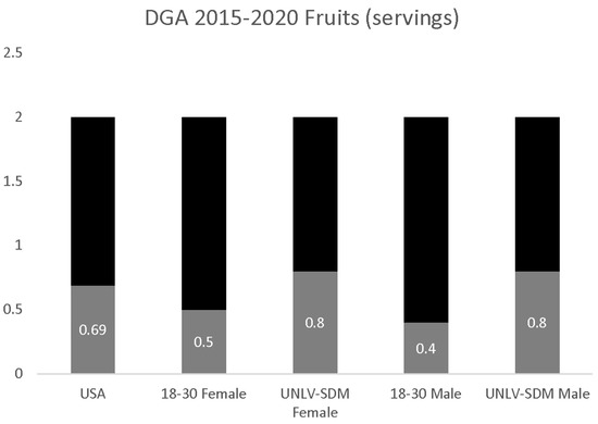 The estimate of overall fruit servings per day (0.69) was significantly lower than the DGA recommendations of 2.0. In addition, fruit consumption among 18–30-year-old females (0.5 servings) and males (0.4 servings) was also significantly lower than the DGA recommendations. Analysis of the data from UNLV-SDM dental students found no significant differences between males and females, p = 0.899. In addition, fruit consumption among females and males (0.8 servings per day) was significantly higher than the U.S. population in general and young adults (18–30), more specifically, p = 0.031 (Figure 1).