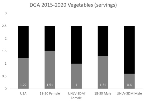 DGA vegetable consumption analysis. Analysis of UNLV-SDM dental students revealed significant differences, with consumption among females significantly higher than males, p = 0.022—although this was lower than the U.S. population in general and 18 to 30-year-olds, more specifically, p = 0.018, and did not meet the DGA recommendations.