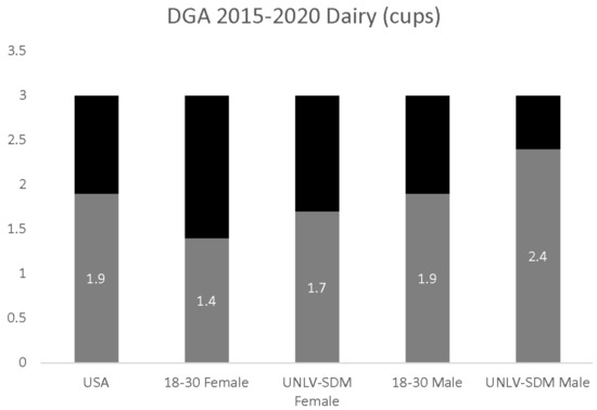 The estimate of overall dairy consumption (1.9 cups per day) was significantly lower than the DGA recommendation of 3.0 cups. In addition, dairy consumption among 18–30-year-old females (1.4 cups) and males (1.9 cups) was also significantly lower than the DGA recommendations (Figure 3). Analysis of the data from UNLV-SDM dental students also found significant differences between males and females, with reported dairy consumption among females (1.7 cups per day) significantly lower than males (2.4 cups per day), p = 0.0014—and different from the U.S. population in general and young adults (18–30), more specifically, p = 0.0388.