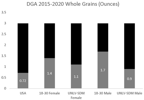 Finally, the estimates of overall whole grain consumption (0.72 ounces per day) were significantly lower than the DGA recommendations of 3.0 ounces (Figure 4). In addition, whole grain consumption among 18–30-year-old females (1.4 ounces) and males (1.7 ounces) was also significantly lower than the DGA recommendations. Analysis of the data from UNLV-SDM dental students also found significant differences between males and females; the reported whole grain consumption among females (1.1 ounces per day) was not significantly higher than males (0.9 ounces per day), p = 0.3687, but was higher than the U.S. population in general and significantly lower than estimated among young adults (18–30 years old), more specifically, p = 0.0026.