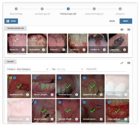 To create the learning modules, a large collection of images related to different presentations and diagnoses of oral lesions were needed. Each image then required meta-information, or tags based on a taxonomy of clinical features. Figure 1 illustrates examples of tags associated with images. The information provided in the tags can be used by instructors to define the classification students will choose in each module, or to balance the presentation of a specific feature presented in each module through searching and filtering (e.g., images of lesions on tongues; red lesions).