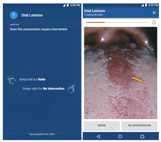 After a module is assembled, it can be administered to students to complete. Figure 2 illustrates how images can be assigned to a stage. The application requires university authentication to verify student identity. Figure 3 presents the smartphone interface for how the learning modules can be completed by students. Students will be presented with an oral lesion image; they are given the choice of either swiping left to choose the action of “refer” or swiping right to choose the action of “no intervention”. Given the importance of the meta-information and tags associated with each image, which are needed to develop learning modules and for providing the suggested action when presented with an oral lesion image in the student interface, the creation and validation of this meta-information structure is the focus of this study.