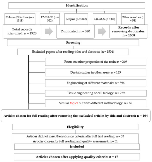 The search in the different databases yielded a result of 1608 records (after eliminating duplicates). After the complete reading of abstracts, and application of the exclusion criteria, 51 relevant articles were found. Finally, when applying the quality criteria, 17 articles were chosen for the systematic review (Figure 1—Table 1) [3,20,29,30,31,32,33,34,35,36,37,38,39,40,41,42,43]. Following the application of the quality criteria, a minimum of 10 items from a total of 14 were defined, which represents a threshold of 71.4% [27,28].