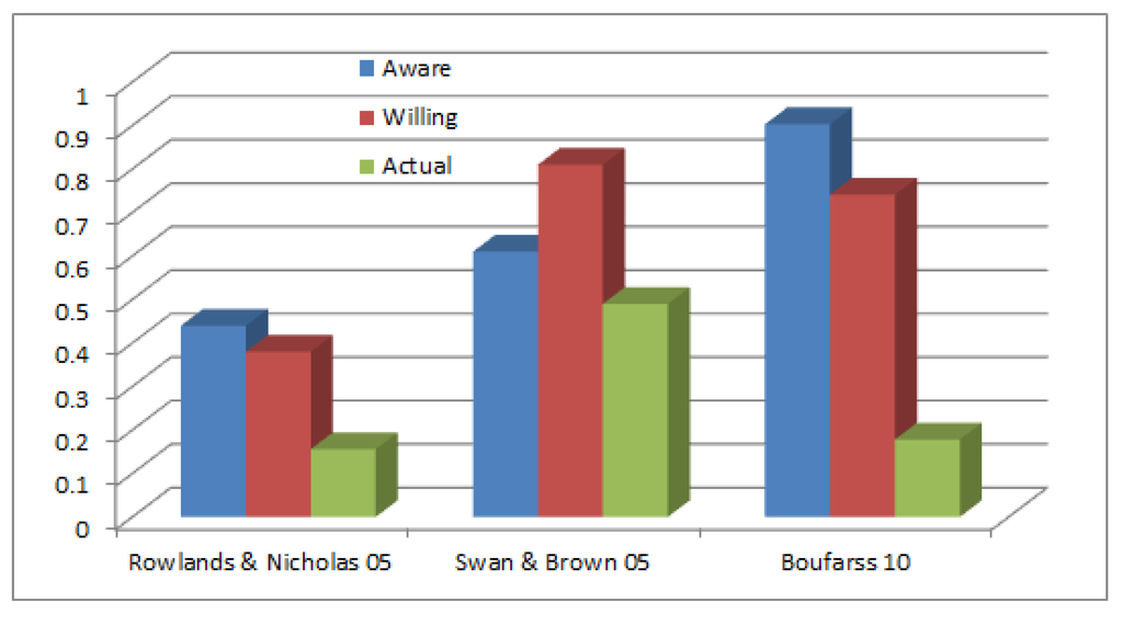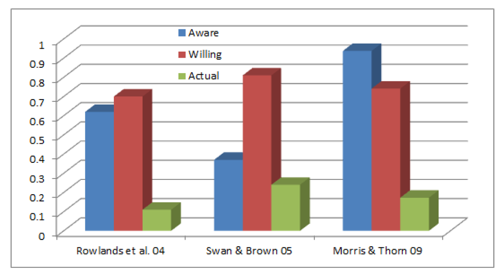 Scholars’ attitudes toward OA are thought to determine their behaviors in OA activities []. Like awareness, attitudes can also be multifaceted. One popular index to measure attitudes in most author surveys is willingness of scholar respondents to comply with a policy mandating participation in OA journal publishing or self-archiving [,,]. A large percentage of scholars surveyed—in many cases more than 70%—show their enthusiasm about contributing to OA. It is reasonable that the ratio of willingness to participation does not match any single reporting time because it usually takes time for intention to be transferred into actual work. Nevertheless, it is unfortunate that over time individual surveys have continued to report a discrepancy in both OA journal publishing and self-archiving (see Figure 2 and Figure 3). These figures show a larger gap in OA journal publishing than in repository self-archiving. Specifically, scholars hold a more positive attitude in favor of submitting articles to an OA journal, but act differently later. Comparatively, if they agree to make contributions to a repository, particularly an institutional repository, they are much more likely to follow through on that commitment.