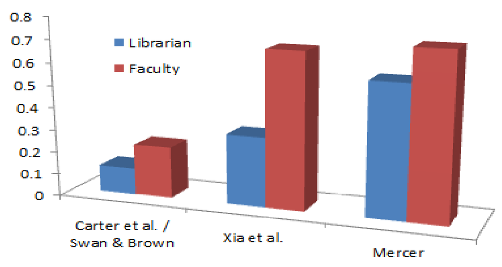 In comparison to faculty who are late adopters of the OA practice, librarians are supposed to present more positive behaviors in OA publishing and self-archiving because of their heavily assumed roles in preserving and disseminating scholarly records, although only a small portion of librarians are exclusively responsible for repository management. Most academic libraries in the United States evaluate the performance of their librarians on scholarship, and hence publishing is often a required part of academic librarianship. It is therefore surprising to find that librarian authors in the United States have authored significantly fewer OA publications and have not participated any more in article self-archiving than faculty in LIS, even though faculty themselves are not active in OA. Counting the numbers of articles available through OA yields a rate of 31.08% for librarian authors as opposed to 68.92% for faculty authors []. The same study finds that the odds of increasing OA citation counts for faculty’s publications are by a multiplicative factor of 0.895. Similar results have also been found by other studies which include faculty in other academic fields []. Figure 4 has a simple comparison of librarians and faculty for their making own articles available in all types of repositories and websites, which shows a visible divide with regard to their OA article supplies and consumptions.