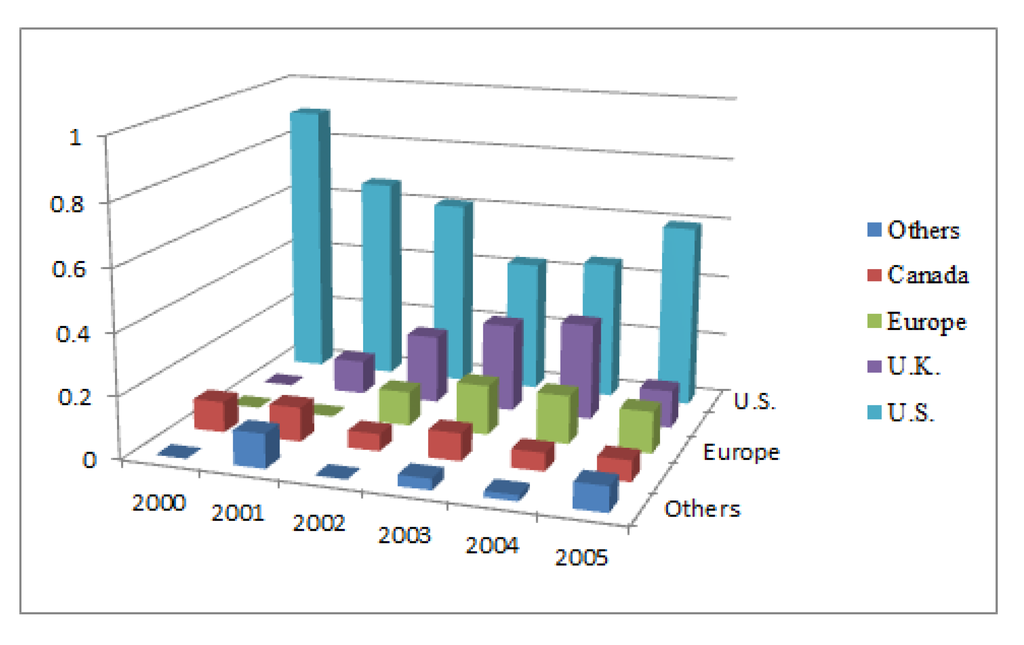Multiple reports all show a developed-developing split in several OA areas [,,]. Specifically, scholars from Africa, Latin and South Americas, and most Asian countries have a high awareness rate of both OA journal publishing and e-print repositories; and in some case the rate is even slightly higher than that of European and North American scholars. However, when data on actual OA actions by these scholars are collected, a geographic developed-developing disparity stands out so that one can easily find that scholars in developing countries have made far fewer OA attempts than scholars in developed countries. When surveyed for their willingness to comply with a mandate policy, if applicable, respondents from developing countries expressed their interest in open access more often than their counterparts in the West. This may be explained by the fact that scholars in developing countries are more inclined for free sharing of scholarly materials because of their limited access to subscription based journals than their counterparts in the developed countries. Their responses represent direct evidence indicating an inconsistency between scholars’ expressed compliance with mandates and their actual level of OA contributions. Figure 5 presents a geographic dissemination of authors whose publications appear in OA journals by major country or region, in which the United States, United Kingdom and Canada are singled out due to their strong performance and all developing countries are summed up for the simplicity of analysis.