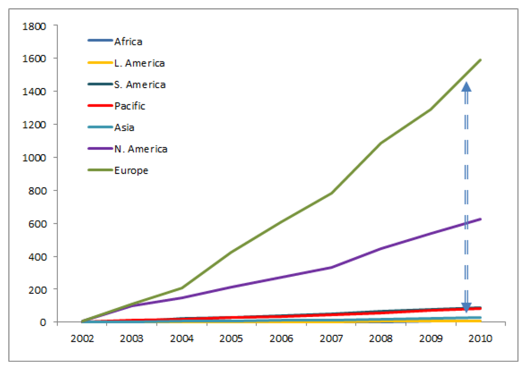 This visualization of the international divide in OA progress is further supported by the numbers of OA journals initiated in developed and developing countries as shown in Figure 6. Data for these figures are gathered from the Directory of Open Access Journals (DOAJ), which is a Web service that includes most of the open access scientific and scholarly journals that apply a quality control system to guarantee the content []. DOAJ offers the most comprehensive list of OA journals with necessary links and metadata for each journal which can be sorted by country and initiation year. To reveal a geographic pattern of the journals, we selected the top 100 countries with the most journals and aggregated the numbers by continent for easy data analysis and visualization. The country designation of a journal is based on the location of its editorial office, rather than the site of its publisher, as this is how data are acquired by DOAJ. Also, the continent classification may provide a biased result for the developed-developing country separation. For example, Mexico, classified as a developing country based on the UN’s Human Development Index, was calculated toward the total journal number for North America which has considerably affected the continental rate after this total number is divided also with two developed countries []. Such exceptions are, of course, rare and can be ignored at the continent level.