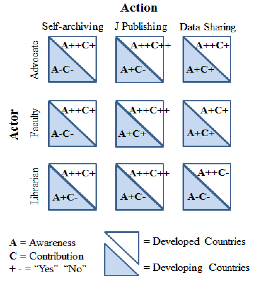 In a general sense, OA may be viewed as a sequence of several consecutive phases, i.e., awareness, attitude, action and allusion, throughout which advocacy pushes the process forward and actor (agent) is the subject who performs every OA task (Figure 1). Of these 6 “a” categories, “action” refers to a participant’s work to (1) self-archive intellectual outcomes in the form of article pre-print or post-prints, reports or other types of written work in a digital repository or on a personal or institutional webpage; (2) contribute raw scientific data and data definitions to a free data repository; (3) post instructional content using open courseware; (4) publish peer-reviewed articles in an OA journal; and (5) make open source programs with original code available to the public. Similarly, the “actor” category can include institutional or library administrators, government officials, association personnel, funding agencies, or renowned scientists among those who advocate for OA. “Allusion” represents the actor’s reuse and repurpose of raw data or open source code, which involves providing necessary credit to the original contributors. As with any analysis of the digital divide, most of these phases of the open access divide contain multiple variables, leading to a wide range of combinations and making the analysis more complicated.