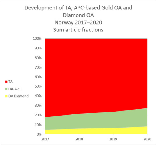 That TA journals convert to OA, even Diamond OA, is part of the development of the journal market, and there are numerous examples of this. What needs special treatment in the case of Norway is a support mechanism called NÅHST (Norwegian Open Humanities and Social Sciences Journals) where the Ministry of Education and Research, the Norwegian Research Council, and a number of HE institutions joined together to finance the conversion of a number of HSS journals publishing mainly in Norwegian from a TA to a Diamond OA model. This included many of the older and more prestigious HSS journals in Norway. Part of the increase in the uptake of Diamond OA publishing in Norway is probably due to this mechanism. In the period 2018–2020, 25 journals were supported through NÅHST [12]. This mechanism replaced a support mechanism from the Norwegian Research Council for OA journals in 2017, but the journals covered by the old and the new mechanisms were not necessarily the same.