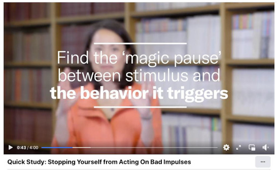 The book underlying the Q2 video [22] is a book aiming at teaching managers how to be better leaders in their relation to co-workers. It is built around five principles, one of which is Presence. In order to enhance one’s capacity for presence, the book suggests working through three steps. The video is built upon elements from Step Two (Regulate: Find the Pause and Don’t Scratch the Itch [22] (pp. 138–145)). Elements in the video are the same as in the book, but there are more and different examples. Furthermore, the order of the presentation is turned around, so that the different substeps presented in the video inductively lead to the conclusion (that leaders need to be more present in meetings and interactions with others). In the book, on the other hand, the argumentative structure is more deductive. Consequently, we have also here a stand-alone video, where the relation to the book is not explicit, but can be recognised, if one reads the book. Furthermore, the video is not an attempt to make a summary of the book. Instead, a small element is taken out and given an independent presentation. In Bucher’s terms, it is a presentation video made by the book author, as the focus is upon presenting a topic.