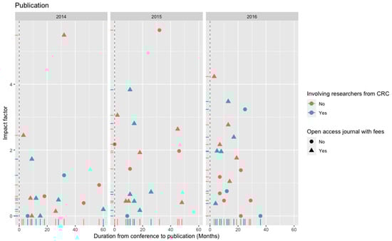 Figure 1 displays the distribution of publications according to journal impact factor and time to publication for each conference year. The majority of the abstracts were published in journals with an impact factor of 0 to 2. There were two abstracts that were published in journals having an impact factor of more than 5; one was published within a year and the other took more than 30 months. The scatter plots for each year demonstrated that the impact factor was not correlated with the time taken to publish (Pearson’s product-moment correlation = −0.05, p-value = 0.714). However, Table 1 shows that the median impact factor of journals in which abstracts were published within 18 months after the conference was higher (1.04 (IQR 0.45, 2.17)) compared to abstracts that were published beyond that period (0.83 (IQR 0.40, 1.92)).