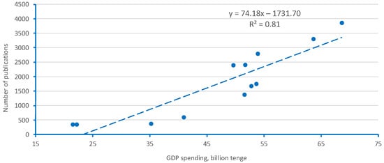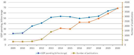 The term R&D is commonly used for the evaluation of science. It includes three main types of research: fundamental research; applied research; and experimental design and experimental development [22]. The national spending on R&D in Kazakhstan is identified as one of the fundamental indicators to assess the country’s technological and scientific development. The spending level is calculated as the total amount of public and private expenditure, expressed as a percentage of GDP. In 2020, this indicator was equal to 0.13% of the country’s GDP. As a benchmark, it was interesting to see the close forerunners to Kazakhstan in the academic field (counted by the number of articles in English in Scopus) and how much of their GDP they spend. Using the Scopus database and GDP related data from the World Bank [27], we found Lithuania, with 4040 articles, invested 1.16% of their GDP, the Philippines, with 4242 articles, invested 0.32% of their GDP, and Qatar, with 4343 articles, invested 0.53% of their GDP.
