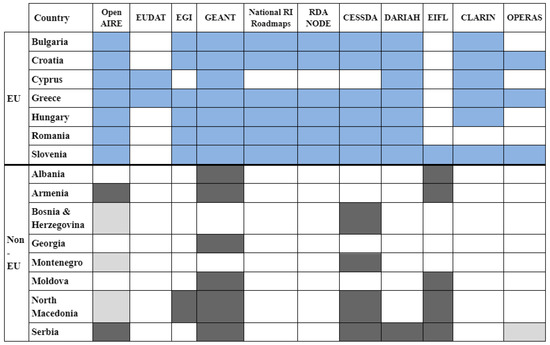 Throughout the NI4OS-Europe project, participation of the partner countries in the so-called “EOSC pillars” (consortia, associations or networks contributing to the development of EOSC) has been monitored as an indicator of progress towards EOSC integration. The list of the “pillars” is as follows: OpenAIRE (OpenAIRE—Open Access Infrastructure for Research in Europe) is a European infrastructure for Open Science: https://www.openaire.eu, accessed on 20 July 2022); European Grid Infrastructure (EGI, which seeks to provide access to high-throughput computing resources in Europe using grid computing techniques: https://www.egi.eu, accessed on 20 July 2022); Research Data Alliance (RDA, a research community organisation striving to facilitate open data sharing at a global level, founded in 2013 by the European Commission, the American National Science Foundation and National Institute of Standards and Technology, and the Australian Department of Innovation; it relies on a network of national RDA nodes: https://www.rd-alliance.org/, accessed on 20 July 2022); and GÉANT (Gigabit Research and Education Network, which is a pan-European network connecting national research and education networks (NRENs) across Europe: https://geant.org/, accessed on 20 July 2022). The list has been limited to the “ones that are relevant for the majority of the NI4OS-Europe countries” [1]. In line with the focus of this study, we will use the term “Open Science networks” and extend the list to include a number of organisations, initiatives or European Research Infrastructure Consortia (ERICs) involved in EOSC-related projects and the development of infrastructure, services, tools, guidelines and best practice relevant for open scholarly communication. These are EUDAT (European Collaborative Data Infrastructure, which is a European infrastructure that integrates data services and resources supporting research: https://www.eudat.eu/ accessed on 20 July 2022); National Research Infrastructure Roadmap (https://www.esfri.eu/national-roadmaps, accessed on 20 July 2022); CESSDA (Consortium of European Social Science Data Archives, which is a European Research Infrastructure Consortium that offers data services to the social sciences by bringing together social science data archives across Europe: https://www.cessda.eu/, accessed on 20 July 2022); DARIAH (Digital Research Infrastructure for the Arts and Humanities, which is a European Research Infrastructure Consortium that supports digitally-enabled research and teaching across the arts and humanities: https://www.dariah.eu/, accessed on 20 July 2022); EIFL (Electronic Information for Libraries, which is a not-for-profit organization supporting libraries in developing and transition economy countries to gain access to knowledge: https://www.eifl.net/, accessed on 20 July 2022); CLARIN (Common LAnguage Resources and Technology INfrastructure, which is an ERIC offering language data, language technology data processing and expertise to the research community: https://www.clarin.eu/, accessed on 20 July 2022); and OPERAS (a European Research Infrastructure dedicated to open scholarly communication in the social sciences and humanities: https://www.operas-eu.org/ accessed on 20 July 2022). Involvement in such networks offers to participants various opportunities (e.g., to participate in projects and training; qualify for technical support; have access to infrastructure, tools and services, data and guidelines; and exchange information, etc.).