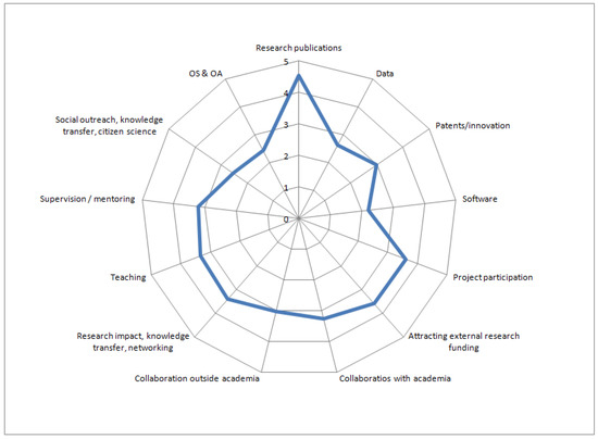 The responses to the question about internal rules for OS-related topics (intellectual property rights, open-source software, publishing platforms, article and processing charges) suggest that in most institutions across the region, OS practices were encouraged. However, the data are inconsistent with the findings of the expert survey and we will not analyse them further. As far as research evaluation is concerned, the survey data show that publications were identified as the most important parameter for researcher evaluation in the NI4OS-Europe partner countries. On the other hand, data sharing, software, OS and OA, social outreach, knowledge transfer, and citizen science were recognised as little to moderately important. The radar diagram of Figure 2 is based on the responses to the question “Which of these aspects are taken into account most when evaluating researchers?” provided by researchers and representatives of research performing organisations (CREATE). The respondents were expected to assess 14 options (13 options presented in the diagram and “Other”) as not important, little important, moderately important, important, or very important. The responses were translated into numerical values and an average value was calculated.