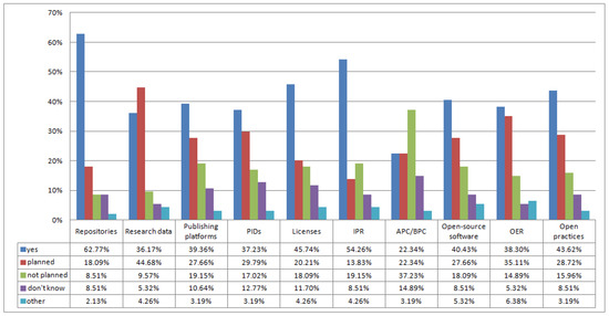Although the landscaping survey addressed various levels (national, institutional) and aspects of policies (open access to publications and research data, sharing software under free licences, the preservation of scientific information, information and data security, rules regarding repositories, publishing platforms, FAIR principles, intellectual property rights, access to services and terms of use), the responses were inconsistent, especially as regards institutional policies [11]. Additional efforts were made to refine the data through an expert survey [1,8].