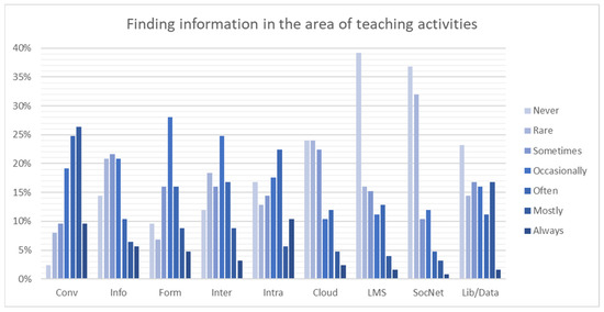 Respondents (26.4%) mostly found information related to teaching in conversations with colleagues, which may indicate informal and implicit (tacit) forms of finding the necessary information. The intranet allows frequent retrieval of information (22.4%), which agrees with the common practice, according to the author’s experience, of placing information about subjects, teaching calendars, etc., in that channel of communication. As an occasional possibility for finding teaching activity information, the respondents chose formal groups (28.0%), public internet institutions (24.8%), and informal groups (15.2), (21.6%). The cloud and its services are represented never or infrequently (24.0%), which corresponds with the results of other technologies based on the cloud and are also poorly represented as a diffusion channel. LMS (39.2%), social networks (36.8%), as well as libraries (23.2%), are the worst represented as a source of information needed for teaching, i.e., these percentages represent the “never” category. The search for information through databases or libraries in this sample shows that there is very little or no use for them in the teaching process, while tacit and informal channels of communication are more present. Is it because polytechnics are declared as higher professional schools, so that information for teaching activities is in the narrower professional groups, both formal and informal, through direct communication?