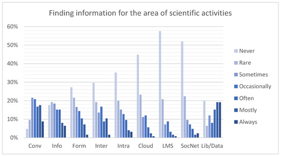 When sharing official information, and given that it also includes administration to a greater extent, the email channel comes to the fore, showing the highest usage values of all activities. As another sharing channel, conversation stands out, in addition to formal groups. There is only one difference between the science fields, regarding the email channel, which is used to a much greater extent within the social science group of scholars. Thus, administrative activities, whether searching for or sharing information, correspond to a formal network structure that includes a procedural hierarchy, policy, and organisational schemes, and is generally public [9].