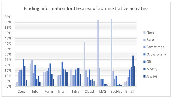 For the needs of institutional and administrative work, respondents mostly (28.8%) collect information via email and often (25.6%) through conversation with colleagues and within formal groups (21.6%). Social networks, LMS, and the cloud are the least used. According to the results of this sample, it is obvious that email still has primacy in business communication, although there are various other possibilities for exchanging such information, such as the cloud, which offers significantly higher modalities and platforms for this type of communication, for example, the DMS (Document Management System).