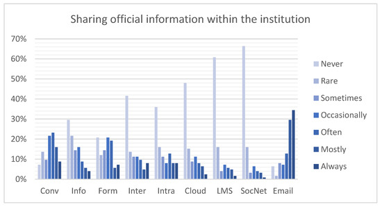 Figure 4 shows the percentages in the answers to question 18, i.e., the channels through which scholar most often share or forward formal information within their institution. The figure shows answers of all respondents (n = 125). The components for question 18 are presented in Table 1.