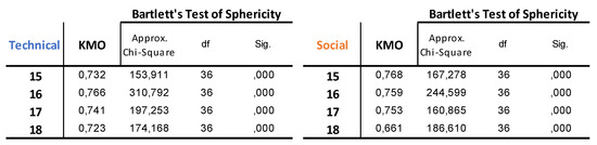Before extracting the components, tests to assess the goodness of fit of the data, the Kaiser–Meyer–Olkin (KMO) measure of sampling adequacy and Bartlett’s test of sphericity, were performed [22]. Figure 5 shows the values obtained for the technical and social areas where the suitability test indicates moderate and medium index values, ranging from 0.661 to 0.768, with p-value < 0.05, which confirms the justification of the factor analysis.