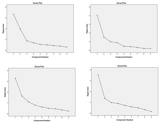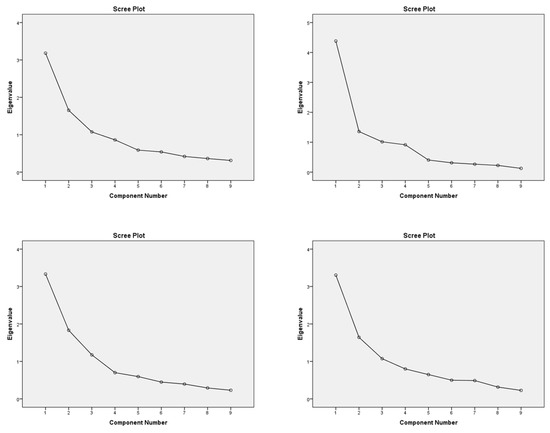 To reduce the number of components, the eigenvalue, the percentage of variance, and the cumulative percentage of variance were determined for each component. Although there is another way to determine the number of extracted components, for this analysis, a Cattell diagram (Scree plot) was used to evaluate the optimal number of components for extraction through several iterations for both fields of science (Figure 6 and Figure 7). Two factors for both fields are retained, while the other components enter the flatter part of the curve, which means that each subsequent component has a smaller and smaller number of eigenvalues.