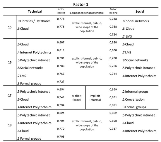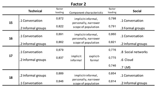The components are often grouped around similar variables, in this case around similar modes of communication. For all four questions there are two factors with several components that are similar. For better visibility, in Figure 9 and Figure 10, we have presented the two obtained factors with their components regarding the area and activities where they are shown. The name of the factor is not assigned, but the essential characteristics that determine the conceptual meaning are indicated. For Factor one, the components that are singled out for both scientific fields from questions 15, 16, and 18 have the communication channel characteristics of explicit–formal, public, and wide-scope. Question 17 indicates the difference between the two fields, where the technical field has the characteristic of explicit–formal, while the social field uses implicit–informal communication channels. For Factor two, the components that are singled out for both scientific fieldsin questions 15, 16, and 18 have the communication channel characteristics of implicit–informal, personal, and narrow-scope. Question 17 indicates the difference between the two areas, where the technical field has the characteristic of implicit–informal, while the social field uses explicit–formal communication channels.