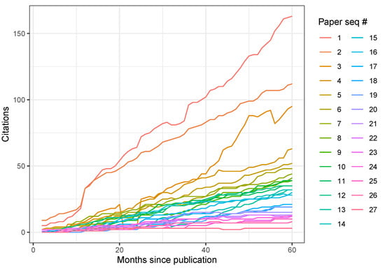 As another verification of this constant growth rate, we modeled a simple linear regression to each paper using citations as the outcome variable and months-since-publication as the only predictor variable. All but the last two (least cited) papers measured an adjusted