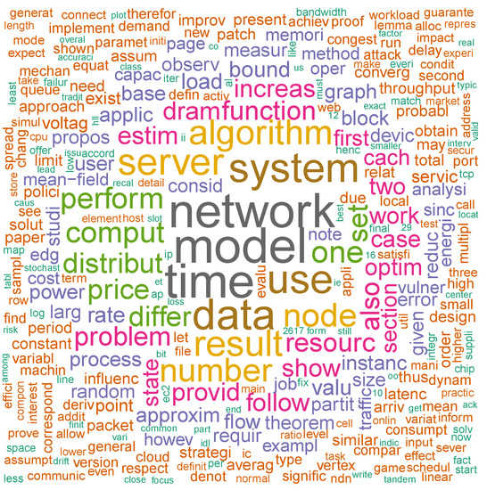 Figure 6, such as “network”, “model”, “time”, “data”, “system”, “server”, and “algorithm”, which are typical of performance evaluation, as we’d expect. The implication here is that while these latter terms may well characterize SIGMETRICS papers overall, they do not differentiate well between highly cited and moderately cited papers.