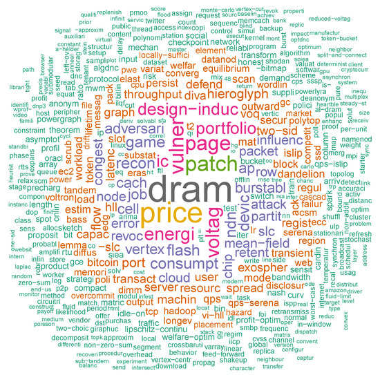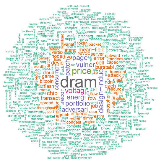 Figure 8 shows, there are fewer influential terms overall now, because there are few highly cited papers. The two most cited papers, #1 and #2, are also the ones that focus on DRAM, so not surprisingly, this term retains the highest weight. The term “price” is mostly split among three papers, some better-cited than others, which leads to a small reduction in its weighting. Overall, it appears from the figure that the most cited topics in SIGMETRICS’17 relate to memory, energy consumption, and security. This set has nearly no intersection with the most common terms from