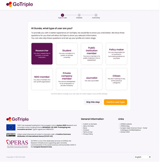 For example, the “user type” compass indicator under the “diversity and inclusivity” category captures whether the user is a researcher/academic or another category of user such as a journalist, an individual from the private sector, or an individual from an NGO, for example. This indicator could indeed further enhance the understanding of the diversity in the user base and tell us if GoTriple has managed to entice users beyond research and academia. This information (the type of user) is provided by the user at the time of registration (see
