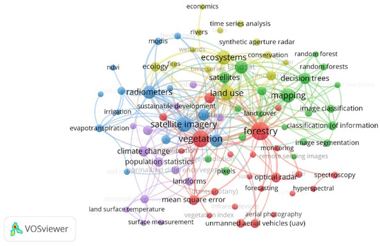VOSviewer results of co-occurrences in papers published in Sustainability 2009–2021 with key terms “remote AND sensing”: see Appendix A.2 for details.