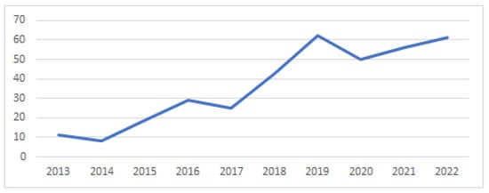 From 2013 until July 2022, the journal published 322 papers in 10 volumes consisting of 1 to 4 issues per year. Table 2 gives an overview for all ten years. Table 3 shows the numbers for both five-year periods. The number of publications per year grew almost steadily (Figure 1). Please note that the dataset applied for the further analyses included issue 1 and 2 from 2022 (27 contributions), and two contributions from issue 3, as of July 2022. Figure 1 includes the status in December 2022 with 12 contributions in issue 3 and 20 in issue 4 for 2022, which makes 61 contributions for 2022. Overall, 606 authors contributed to the journal.