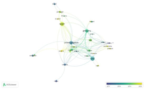 Publications received contributions from authors from 59 different countries. Eleven articles were written by authors from three and more countries, 53 by authors from two countries, and 258 by authors from one country only. Table 9 shows the number of articles involving a country, for the countries with at least 10 contributions, i.e., at least one author is from that country. The top five countries that collaborate with many different countries are Germany (22), UK (21), France (19), USA (18), and Spain (15). Twelve countries do not have any collaboration with other countries. Table 10 and Table 11 show the numbers for the periods 2013–2017 and 2018–2022, respectively. In the first 5-year period, 12 countries had at least two contributions in Publications. Between 2018 and 2022, 27 countries had at least two contributions. The collaboration rate with unique countries (Column 3, Table 10 and Table 11) and the overall collaboration rate (Column 4, Table 10 and Table 11) grew as well. Figure 4 visualizes the country contributions over time.