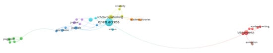 VOSViewer clusters the 31 keywords that occur at least two times in the period 2013–2017 (Figure 5). The main cluster in light blue covers the topic of open access, which relates to the red cluster concerned with bibliometrics and evaluation. The timely distribution of the keywords shows two phenomena. First, the number of different keywords grows, i.e., there are more and more articles with different topical foci. Second, new topics more widely related to the scope of scholarly publication seem to become relevant and be published within the journal, expanding the journal’s scope. New topics are, for example, open science from 2018 on, fake news and disinformation (relevant in 2021), data science, science communication, open and fair data, and open peer review. Keywords, including plagiarism and scientific fraud do not occur under the top keywords in 2018–2022. Open access stays a core topic, as does scholarly publishing and article processing charges. However, the variety of different topical contributions has grown over the ten years, which is visible in the distinguishable larger keyword network for the period 2018–2022 (Figure 6).
