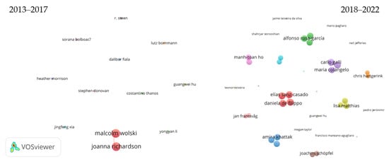 Author networks for both 5-year periods (n = 12 and n = 39, at least 2 documents). Node size indicates the total link strength. Source: VOSViewer.