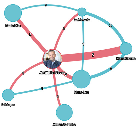 Figure 3 represents a map that was generated with the collected data. This map focuses on a specific author and their colleagues, making it a collaboration map. It also indicates that, in a given set of conditions, the strongest relation occurred between the author and one of their colleagues, with five publications in common (collaborations).