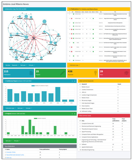 Figure 5 presents an overview of the main functionalities when applied to an author’s page. The knowledge map and data viewer are the main elements of the page, followed by other statistics, such as the total count of publications (and more), bar charts for publications and projects in a given year, most common keywords and areas and top collaborators. Note that a similar page was developed for the institutional scope, as well as a page for managing the authors and importing their data from external sources.