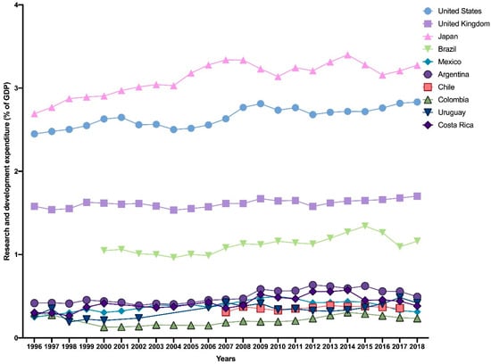 Emerging economies struggle to commit sufficient funding for research relative to their gross domestic product. For example, countries such as Japan, Great Britain, and the United States invest almost 3% of their gross domestic product into research [2]. In stark contrast, most Latin American countries invest less than 1% of their GDP in this manner (Figure 1). This obvious shortcoming and consequent lack of funds retards the progress of scientists in this region. The result is that only the most successful individuals in the field of research and technology obtain local or external funding. The recent economic crisis in this region has further exacerbated these limitations. This is particularly true in the more developed countries in the area, where local funding was previously available through government councils. These limitations are often volatile and dependent on current government policies [3] and, more recently, hampered by political interference [4]. The situation has worsened in the less developed countries in the region that have depended heavily on international funding through special programs sponsored by foreign sources. Unfortunately, the recent COVID-19 pandemic has caused the support offered by international aid programs to underdeveloped countries to nearly cease [5,6].